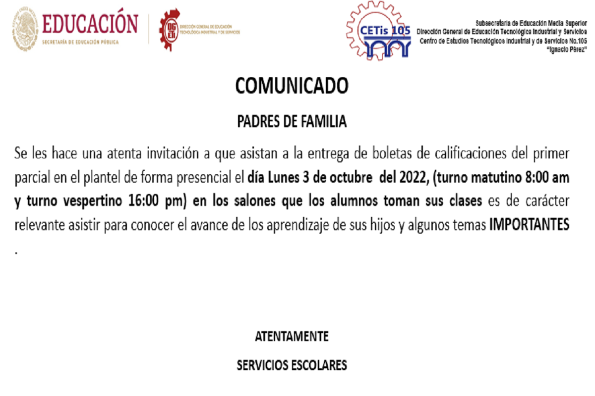 Se les hace una atenta invitación a que asistan a la entrega de boletas de calificaciones del primer parcial en el plantel de forma presencial el día Lunes 3 de octubre del 2022, (turno matutino 8:00 am y turno vespertino 16:00 pm) en los salones que los alumnos toman sus clases es de carácter relevante asistir para conocer el avance de los aprendizaje de sus hijos y algunos temas IMPORTANTES .
