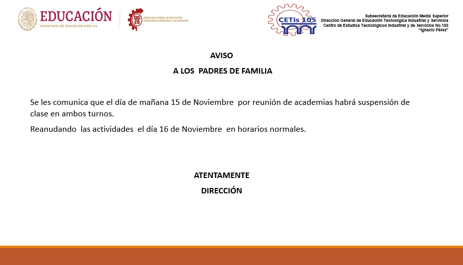 Se les comunica que el día de mañana 15 de Noviembre por reunión de academias habrá suspensión de clase en ambos turnos.