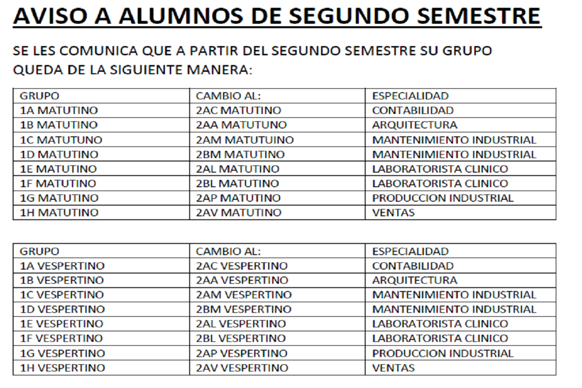 alumnos regulares la inscripción es el día 9 de enero en los horarios de 9:00 a 13:00 turno matutino y 14:00 a 18:00, turno vespertino, favor de revisar la nomenclatura correspondiente a la especialidad que corresponden