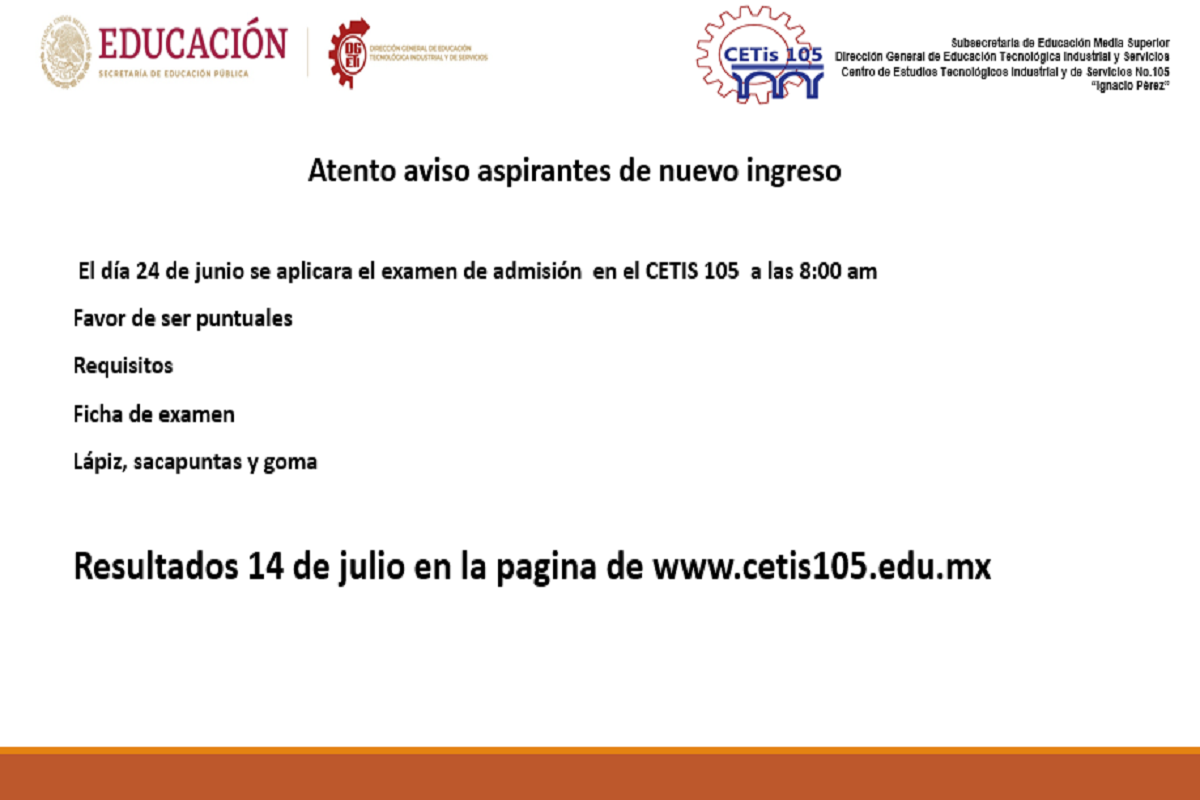 El día 24 de junio se aplicara el examen de admisión en el CETIS 105 a las 8:00 am