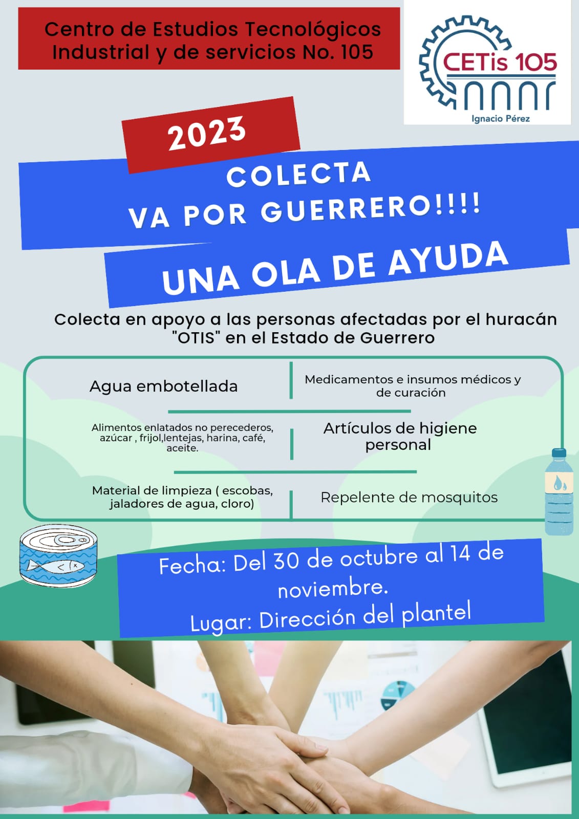 SE SOLICITA SU VALIOSO APOYO PARA EL ACOPIO DE PRODUCTOS NECESARIOS, PARA LA COMUNIDAD DE DGETI ACAPULCO Y SUS FAMILIAS AFECTADAS POR EL HURACAN OTIS EN EL ESTADO DE GUERRERO.