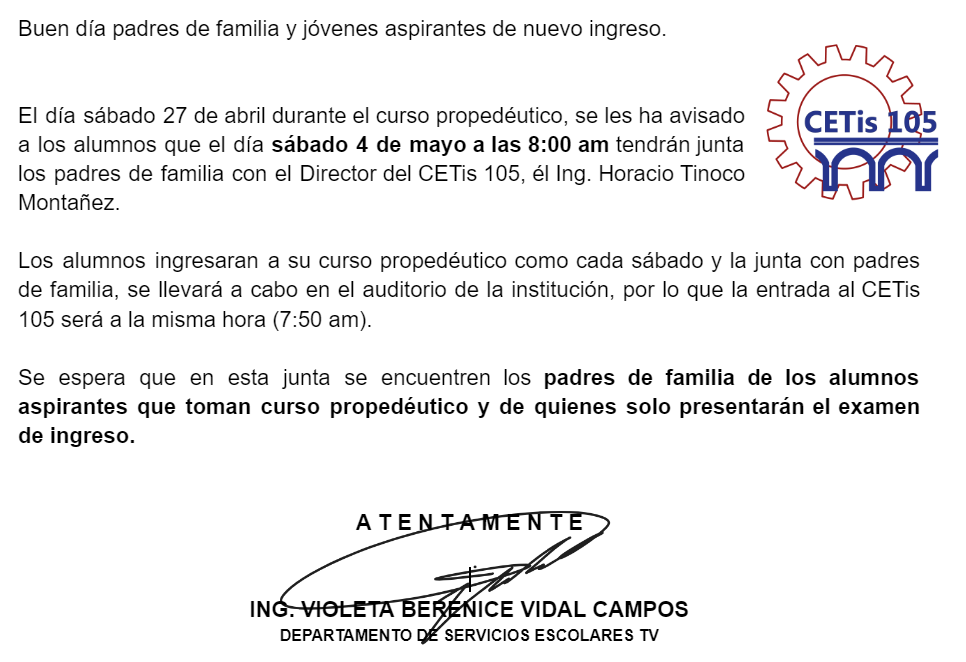 El día sábado 27 de abril durante el curso propedéutico, se les ha avisado a los alumnos que el día sábado 4 de mayo a las 8:00 am tendrán junta los padres de familia con el Director del CETis 105, él Ing. Horacio Tinoco Montañez.