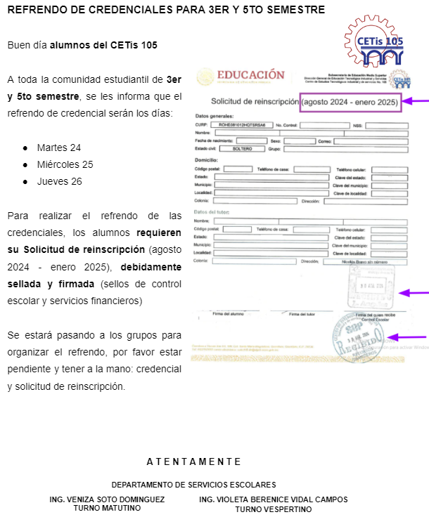 Para realizar el refrendo de las credenciales, los alumnos requieren su Solicitud de reinscripción (agosto 2024 - enero 2025), debidamente sellada y firmada (sellos de control escolar y servicios financieros)