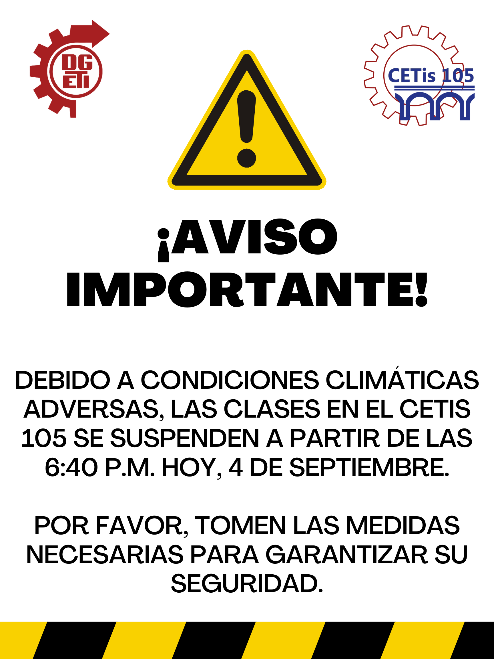DEBIDO A CONDICIONES CLIMÁTICAS ADVERSAS, LAS CLASES EN EL CETIS 105 SE SUSPENDEN A PARTIR DE LAS 6:40 P.M. HOY, 4 DE SEPTIEMBRE. POR FAVOR, TOMEN LAS MEDIDAS NECESARIAS PARA GARANTIZAR SU SEGURIDAD.